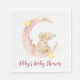 Niedlicher Elefant sitzend auf einem halbmondförmigen Mond mit goldenen Sternen, Blume und Glitzer auf weich weißem Hintergrund für eine kleine Mädchendusche. Text ist bearbeitbar.