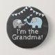 Dieser entzückende hintere Knopf des Abzeichens oder des Buttons erklärt allen Ihren Babyduschengästen, ", das ich die Großmutter bin". Blaue, graue und weiße Tupfenelefanten. Tafelblick-Hintergrund. Flaggenflaggen. Fertigen Sie den Schriftart besonders an. Personifizieren Sie dieses Abzeichen für alle Familienverwandten.  Vervollkommnen Sie für die große Schwester, Tante, groß - Großmutter, Patin und Mama-zusein.  Dieses Bild ist in anderen Farben mit zusammenpassenden Produkten verfügbar. Besuchen Sie bitte "die Hungarican Prinzessin - eine Butike" @ zazzle.com/hungaricanprincess*. Schauen Sie in der "Babyparty" Kategorienabteilungs- oder -sammlungsseite. Glückwünsche.