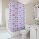 Rosa, lila und grünes Elefantmuster auf lila Duschvorhang.