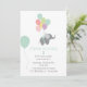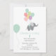 Niedliches Baby's erste Geburtstagsfeier Einladung in Weiß, mit süßen Grafiken eines kleinen grauen Elefanten gehalten aloft mit bunten Ballons. Personalisieren Sie den Text auf der unteren Hälfte der Einladung, um Ihre Bedürfnisse Anzug.