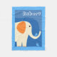 Niedliche Fleecedecke für Baby oder Kleinkind. Elefant spritzt Wasser von seinem Stamm mit zwei blauen Vögeln, die an schauen. Blauer Hintergrund. Addieren Sie den Namen Ihr Kindes.