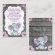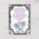 Bibliothek für Baby, Reservierungskarte für einen lila, aquamarinen, türkisfarbenen und grauen Duschelefanten.