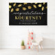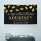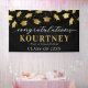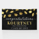 Modernes Graduiertenbanner mit einem trendigen schwarzen Hintergrund, der in jede beliebige Farbe verändert werden kann, fallenden Imitate mit Goldfolienmützen und einer Gratulationstext-Vorlage, die leicht zu personalisieren ist.