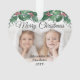 Celebrate the simple joys of the holidays with a custom Merry Christmas two photo heart-shaped acrylic ornament. The pictures and all wording on this template are easy to personalize and can be different or the same on front and back. The script can be changed to First Christmas, Seasons Greetings, a name, or other text of your choice. The modern red, green and white oval design features botanical holly leaves and berries, elegant classic script typography, and 2 favorite photos. This unique holiday keepsake adds a stylish touch to Xmas home decorations. Merry Christmas!