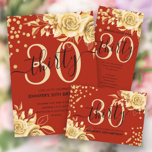 Elegant Gold Red Floral Glitter 30th Birthday SetDesignt von Marta Burton