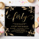 Eleganter Chic Botanical Black und Gold 40 Script 40. Geburtstag Einladung. Diese moderne Geburtstagsfeier-Einladungsvorlage beinhaltet stilvolle "vierzig" Textausschnitte in riesigen Imitaten, Goldfolie Wirbel handgeschriebene Kalligraphie (oder Typografie)-Schrift mit swash-Schwänzen, Imitats mit botanischem Blattgold, Party-Details in goldener Farbe auf schwarzem Hintergrund. Diese Einladung eignet sich hervorragend, um 40 Meilensteine Geburtstage im Stil zu feiern. Sie verleiht jedem Party eine Touch des Glamours, sowohl für Männer als auch für Frauen.