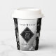 Feiern Sie mit diesen stilvollen Papiertassen das 70. Platinhochzeitjubiläum! Elegante Schwarz-Weiß-Schriften mit hexagonalen Konfetti auf Platin-Folie-Hintergrund verleihen diesem besondere Anlass eine unvergessliche Touch und einen außergewöhnlichen Meilenstein. Personalisieren Sie mit den Namen des Paares und den Jahren der Ehe. Umkehrung zeigt identisches Design. Design © W.H. Sim. Weitere Informationen unter zazzle.com/expressionsoccasions