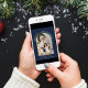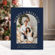 Elegante, blau gefaltete Urlaubskarte mit Ihrem Foto in einem Bogenrahmen, "Frohe Weihnachten" in klassischer Goldserfinsttypografie und Ihrem Familiennamen in schlichter moderner Goldtypografie. Im Inneren personalisieren Sie Ihre saisonale Botschaft an Freunde und Familie.