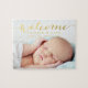 Einfache moderne Elegant Baby Birth Foto Ankündigung Puzzle | Gold Foil Begrüßungsskript. Elke Clarke Designs ©. Mehr Stile in unserem Shop erhältlich. Goldfolie (gedruckter Foto-Effekt) Typografie-Overlay mit dem Wort "willkommen" in einem Schriftart mit Handschrift. Einfaches, elegantes und vielseitiges Design, das Sie individuell gestalten können.