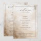This elegant wedding program features a soft, cloud-like background in warm beige and light brown tones, creating an ethereal atmosphere. The minimalist design showcases clean lines and ample negative space, with a mix of flowing script and traditional serif fonts that add sophistication. Customizable placeholders allow for personalization, making it perfect for a formal ceremony. The serene color palette and uncluttered layout convey warmth and anticipation, ideal for celebrating this significant life event.