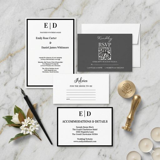 Add a sophisticated finishing touch to your stationery with this Elegant Black and White Wedding Invitation Belly Band. Designed to perfectly coordinate with the Emili and Daniel suite, this wrap features a crisp modern serif monogram ("E | D") centered on a clean white background with a bold black border. This belly band is the ideal functional accessory to hold your invitation, RSVP card, and details card together in one polished package. Its minimalist aesthetic is perfect for couples seeking a timeless, high-end look for their formal or modern wedding.