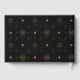 This elegant wedding guest book features a sophisticated black background adorned with intricate gold celestial motifs, including stylized stars and circular designs arranged in a balanced grid pattern. The central text box, outlined in thin gold, showcases customizable names and dates in a classic serif font, complemented by a flowing script for the word "and," adding a personal touch. The luxurious contrast of deep black and metallic gold creates a timeless and celebratory mood, perfect for formal occasions. Ideal for capturing well-wishes from loved ones, this design blends modern aesthetics with vintage charm, making it a memorable keepsake for any special event.