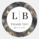 This elegant wedding sticker features a luxurious marbled background in dark gray and black with gold accents, creating a sophisticated and contemporary look. The design includes bold, capitalized initials "L" and "B" separated by a vertical line, set within a clean white circle that contrasts beautifully with the intricate backdrop. Below the initials, the phrase "THANK YOU" is elegantly displayed in a classic serif font, conveying gratitude with timeless style. Perfect for adding a personalized touch to wedding favors or gifts, this sticker combines modern minimalism with traditional elegance, making it an ideal choice for celebrating special moments.