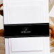 A classic and elegant wedding invitation belly band featuring a black background with refined white typography and a delicate white border.