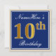 Dieses schlichte und elegante Geburtstagsgeschmacksmuster enthält eine personalisierte Botschaft wie "NameHere’s 10th Birthday" (mit dem "10th" mit einem Imitat/Imitation in goldenem Farblook) in einem blau-farbenen quadratischen Bereich mit einer schlichten Kontur. Der Name ist in einem eleganten, weiß gefärbten, skriptähnlichen Text und kann angepasst werden. Die Rückseite bietet individuell anpassbare Einladungsdetails. Eine solche Einladung zur Geburtstagsfeier könnte vielleicht genutzt werden, um Leute zu einer Geburtstagsparty einzuladen, die für jemanden veranstaltet wird, der seinen zehnten Geburtstag feiert. [~Z0000228]