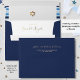 Mit diesem eleganten Bar Mitzvah-Angebot laden Sie Freunde und Familie ein, mit einem blauen, marinösen, weiß und goldgestreiftem Tallit-Design! Die Möglichkeit, Ihre Zeremonie und Empfang, Mittag, Abendessen oder Party Details hinzuzufügen! Goldstreifen, Bar Mitzvah Phrase und Stern von David in Imitaten Goldfolie. Moderne handgeschriebene Kalligrafiedetails. Stilvoll in marineblau mit dem Namen in der Mitte in goldenen Farbtönen.