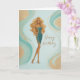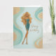 A stylish birthday card featuring a glamorous blonde in a sparkling teal and gold dress, set against a soft abstract background with flowing gold accents. Perfect for celebrating someone with confidence, beauty, and effortless style.