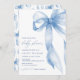 Lassen Sie Ihre Gäste zu einer schönen Feier mit einer eleganten "Dusty Blue Bow" Baby Dusche Einladung einladen. Mit einer weichen, staubblauen Farbpalette und einem zarten Bogen-Design strahlt diese Einladung Eleganz und Charme aus. Die anmutige Typografie fügt eine raffinierte Touch hinzu, die sich perfekt für eine zeitlose und schicke Babydusche eignet. Ob es sich um eine intime Ansammlung oder eine größere Feier handelt, diese Einladung Set wunderbar den Ton für ein unvergessliches Ereignis voller Spannung und Freude, während Sie sich darauf vorbereiten, Ihren kleinen Jungen in die Welt zu begrüßen.
