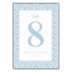 This elegant wedding table card features a minimalist design with a soft blue and white color palette, creating a serene and classic aesthetic. The central focus is the large, bold number "8" framed by an intricate damask pattern in light blue, adding traditional elegance to the layout. Delicate script typography at the top reads "table," while clean sans-serif fonts display customizable names and date below the numeral. The balanced composition and ample negative space ensure clarity and readability, making it perfect for formal events that call for a refined presentation.