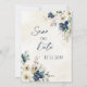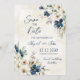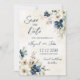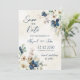 A gorgeous save the date card for your wedding with elegant navy blue and teal watercolor flowers and winter greenery.