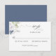 Elegante Hochzeitskarte mit wunderschönem Aquarell, blauen und weißen Blumendetails und eleganten, modernen handschriftlichen Kalligrafieelementen. Einfach und stilvoll. Zurück mit marineblau. Auch erhältlich mit Rückseite in staubblau oder in weiß mit Blumen. Das gleiche Design auch mit den Mahlzeiten Optionen, sowie in der Postkarte. Teil unserer "Elegant Bliss" Kollektion mit einer Vielzahl von aufeinander abgestimmten Einladungen, Beipackkarten, RSS-Karten, Mailingzubehör, speichern Sie die Daten, Dankeschön-Karten und Event-Zeichen und Produkte.