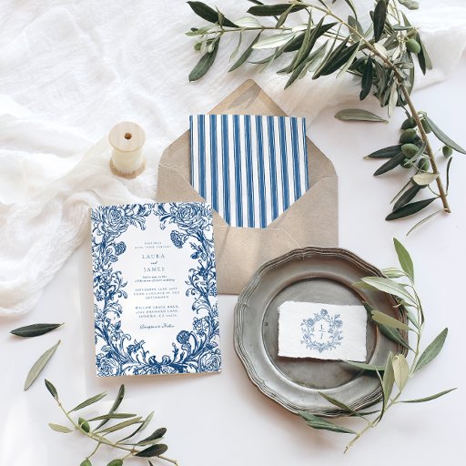 Perfect for bundling invitations, RSVP cards, and details cards together while creating a polished and cohesive presentation. The timeless blue and white floral crest design pairs beautifully with traditional, garden, coastal, and French country wedding themes.