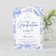 An elegant graduation celebration design featuring a delicate blue toile floral border inspired by classic European porcelain and vintage botanical prints. The intricate florals frame a clean arched center panel, creating a refined and timeless composition that highlights the graduate’s name and event details beautifully. Soft blue tones against a crisp ivory background give the design a sophisticated yet celebratory feel. Perfect for a stylish graduation gathering with a classic, romantic aesthetic.