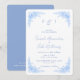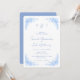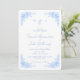 Rounded Blue Floral and Blue Text blue and white background wedding invitation. Wedding website on the back.