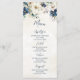 A beautiful menu for your winter wedding table with elegant navy blue and cream watercolor flowers, customizable with your dinner details, available in a wide range of matching wedding products.