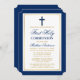 Elegante Navy Blue und Gold Erste Heilige Kommunion Einladung mit Kreuz.