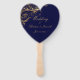 Diese eleganten Hochzeitshandventilatoren verfügen über einen Vintagen goldblühenden Damast, geblüht mit Imitaten Goldkalligraphie-Design auf einem schlichten marineblauen Hintergrund. Personalisieren Sie mit den Braut- und Bräutigamen und dem Hochzeitstag auf der Vorderseite und den Details Ihrer Zeremonie auf der Rückseite. Entworfen von Susan Coffey.