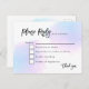 Perfekte Farben für Sommerhochzeiten im Freien, stellen Sie sich baldige Tage und blauen Himmel vor, und dieses elegante Design könnte gut sein! Der Hintergrund ist eine weiche pastellfarbene Mischung aus Blues und Lilacs, und der Titel ist in einem eleganten schwarzen Skript. Die Erholung der Typografie kann leicht personalisiert werden und ist in einem vereinfachten Stil, um das künstlerische Gefühl der Überschrift zu ergänzen. Die hübschen pastellfarbenen Hintergrundfarben bleiben auf der Kartenrückseite erhalten. Ihre Gäste müssen nur ihren Namen schreiben, die entsprechenden Kästchen ankreuzen und die Postkarte in der Post wieder in Pop nehmen.