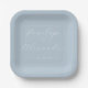 This elegant wedding plate features a minimalist design with a soft pastel blue background and light gray cursive text, creating a serene and sophisticated look. The layout is clean and balanced, emphasizing clarity and focus with ample negative space around the centered names and date. Perfect for adding a touch of romance to your special day, this plate combines modern typography with classic charm, making it an ideal choice for weddings or formal events.