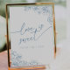 "Liebe ist süß, bitte eine Leckerei nehmen" Schild mit eleganter blauer Chinoiserie für ein blumengeschmücktes Brautparty mit Toile de Jouy Muster. Dieses Dekor, das mit einer zeitgenössischen Touch gestaltet wurde, verleiht Ihrer Feier eine elegante Touch. In dieser Kollektion sind auch passende Einladungen, Einschließungskarten und Schilder erhältlich.