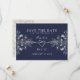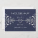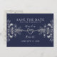 Elegante moderne kalligraphische Drehbuch blaue Hochzeit speichern das Datum Einladung mit einfachem silbernen Seil Herz und vergoldeten Blumen Spitze.