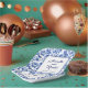 Eine Hochzeitsplatte mit elegantem, blau-weiß-blumengeschmückten Mobiliar.