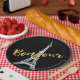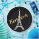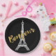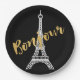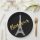 Auf der eleganten Papierplatte befindet sich die weiße Eiffelturm-Silhouette mit modernem goldfarbenem Party auf schwarzem Hintergrund
