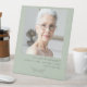 Honor your loved one with a beautifully designed pedestal tabletop funeral photo sign, created to serve as a heartfelt tribute during a funeral, memorial service, wake, or celebration of life. This elegant memorial table sign features sage green color and classic simple floral motif. Add your cherished picture along with custom name and dates, offering a meaningful way to say in loving memory.