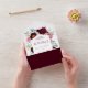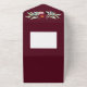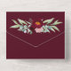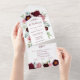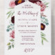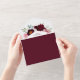 Ein elegantes Aquarellbild mit großen Pfannkuchen und Rose in Bordeaux- und Rosatönen, mit einer schönen Eukalyptusgrüne auf weißem Hintergrund. Die Rückseite der Karte hat einen reichen bordeauxroten Hintergrund und eine große Blumenstruktur. Diese schöne Einladung ist Teil einer passenden Hochzeitssuite, die personalisiert sein kann.