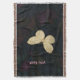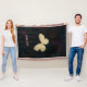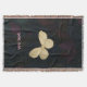 Das Bild zeigt eine geflochtene Decke mit einem großen goldenen Schmetterling in der Mitte auf einem dunklen, strukturierten Hintergrund mit subtilen Farbtönen lila und blau. Die Decke hat Ränder und enthält den passenden Platzhalter-Text "You text" in rosa an der Seite.