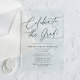 Feiern Sie Ihren Absolventen mit unserem Elegant Celebrate Grand Acrylic Graduation Party Einladungen. Mit "Celebrate the Grad!" in einer ausgeklügelten schwarzen Kalligraphie-Schrift sind diese Einladungen auf einem mattierten oder transparenten Acrylhintergrund für ein modernes und stilvolles Aussehen konzipiert. Personalisieren Sie sie mit dem Namen des Absolventen, dem Namen der Schule, dem Abschluss und den Einzelheiten des Party, um eine einzigartige und unvergessliche Ankündigung zu schaffen. Ideal für Absolventen der Gymnasialschule und Uni, diese Einladungen sind eine elegante Art, diesen besonderen Meilenstein zu ehren!