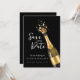 An elegant black and gold Save the Date design featuring a popping champagne bottle, symbolizing celebration and timeless romance. The dark background paired with golden accents creates a luxurious, modern wedding aesthetic perfect for formal, evening, or upscale city weddings. Ideal for couples seeking a classy yet bold announcement that sets the tone for a chic and memorable wedding celebration.