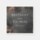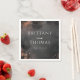 This wedding napkin design features a sophisticated dark charcoal gray background with splatters and speckles of gold and bronze, creating an elegant and rustic charm. The layout is symmetrical, with centered text in a clean serif font that emphasizes the names "BRITTANY and THOMAS," while maintaining balance with understated date information below. The abstract, grunge-like texture adds depth and movement, evoking feelings of celebration and anticipation for your special day. Perfect for adding a touch of luxury to your wedding decor, this design blends modern typography with vintage elements for a timeless look.