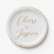 Elegant Cheers Script Glitter Birthday Party Paper Plates. Celebrate in style with this elegant “Cheers to” custom name design, featuring gold script typography on a clean minimalist background. This chic and modern design adds a refined touch to any birthday celebration. Personalize with any name. Ideal for milestone birthdays such as 30th, 40th, 50th and beyond. Gold effect is printed, not real foil.