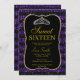Schwarze und lila Imitate Glitzer elegante moderne und moderne Printmedien, Sweet 16 Celebration Party Einladungen. Sehr klassisches und raffiniertes Design für die stilvolle Geburtstagsfrau. Text kann auf alles geändert werden, was zu Ihrer Veranstaltung passt. Schriftart, Schriftart und Text sind vollständig anpassbar! Papierform und -typ können an Ihr Budget und Ihren Geschmack angepasst werden!