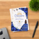 Royal blue gold Quinceanera celebration acrylic invitation. Features brunette girl in ball gown dress, script font, gold butterflies, roses and tiara. Perfect for an elegant princess style glam celebration. Personalize with your own details. Stylish transparent or frosted acrylic invitations.