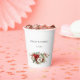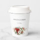 This romantic and classic Christmas or winter-themed paper cup design features a cluster of vibrant red and white winter flowers, pine, holly berries and rustic twigs and editable text fields.