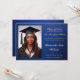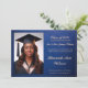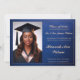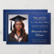 Diese Abschluss-Ankündigungskarte verfügt über ein individualisierbares Foto. Die Karte hat ein blau-goldfarbenes elegantes Design mit dekorativem Skripttext, der den Abschluss für eine Klasse von 2025 Absolventen ankündigt. Es umfasst auch einen anpassbaren Bereich für die Namen der Eltern, die zukünftige Universität des Absolventen und ein Foto auf der Rückseite. Das Layout ist formell und feierlich, ideal, um einen stolzen Meilenstein mit Familie und Freunden zu teilen.