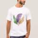 This elegant illustration features three detailed feathers arranged in a harmonious composition, colored in rich purple, green, and golden tones. Each feather is finely textured with soft shading and delicate linework, creating a refined and artistic look with a touch of fantasy and bohemian charm.