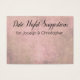Hier gibt es ein lustiges Accessoire, das Sie für Ihre Verlobungsfeier oder die gemeinsame Dusche abholen können: Dates Nacht Sugtionskarten, auf denen die Gäste persönliche Notizen an Braut und Bräutigam schreiben können. Auf der Vorderseite lesen Sie "Date Night Suggestions" in einem eleganten, modernen Script-Schriftart; diese Schrift ist bearbeitbar, sodass Sie eine andere auswählen können, wenn Sie es vorziehen... oder sogar eine andere Nachricht schreiben möchten. Unten ist ein Platz für Ihre Namen. Alle Wörter werden in schwarzer Schrift dargestellt. Sowohl die Vorder- als auch die Rückseite der Karte waren mit einem subtilen, bedrückten Grunge-Bild bedeckt, das mit wirbelnden, laksigen Designs und Einbrüchen sowie rosa und beige Elementen besticht. Die Textur war in einem opak weißen Overlay bedeckt, um die Oberfläche zu beleuchten und für den Text, der auf der Oberfläche gedruckt und geschrieben wurde, viel Kontrast zu schaffen. Der Rücken wurde ohne Worte verlassen und bietet einen Platz für längere, persönliche handgeschriebene Notizen, die Ihre Gäste gerne zur Verfügung stellen. Bitte zögern Sie nicht, mich zu kontaktieren, wenn Sie besondere Wünsche haben oder andere Artikel benötigen. Gerne helfe ich Ihnen auch bei der Anpassung dieser Karten. // Designed by Melody Watson for Paper Muserie